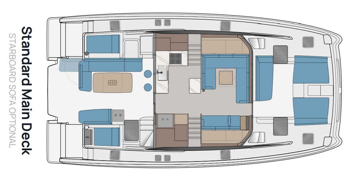 The well-appointed salon and galley features stylish, modern design and expansive windows, creating an inviting and airy space for relaxation and entertaining. Equipped with high-end amenities and a seamless layout, it offers both comfort and functionality for extended journeys.