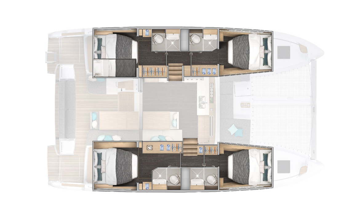 Lagoon’s latest model introduces a groundbreaking feature: an additional aft entryway for each hull, redefining accessibility on board. This innovation enhances the ease of movement between the boat and the dock, prioritizing both comfort and safety to elevate the onboard experience.